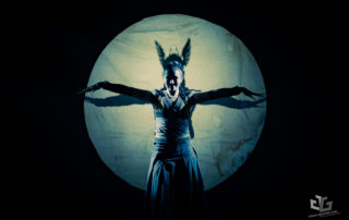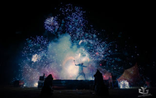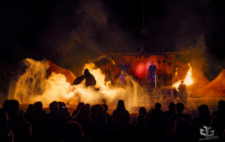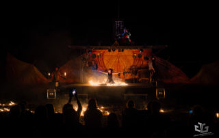 Spectacle de feu comprenant manipulation d’agrès enflammés, musique « en live », remorque scène autonome, décors, multiples effets pyrotechniques et lumineux, costumes de feu et final d’artifices.